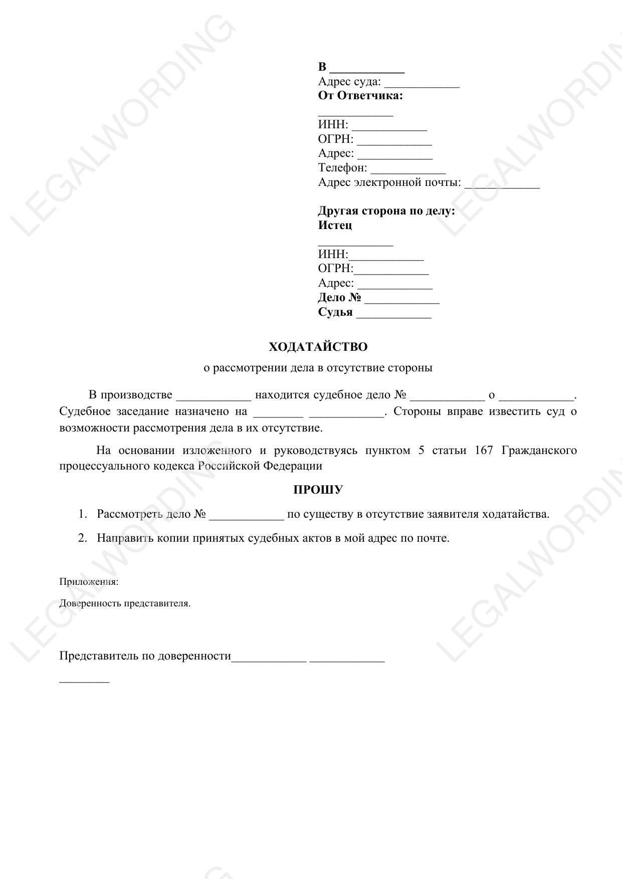 Шаблон ходатайства о рассмотрении дела в отсутствие стороны, предназначенный для подачи в суд юридическим лицом. Данный шаблон помогает юридическому лицу упрощенно заявить о рассмотрении дела без его участия и включает следующие ключевые разделы: