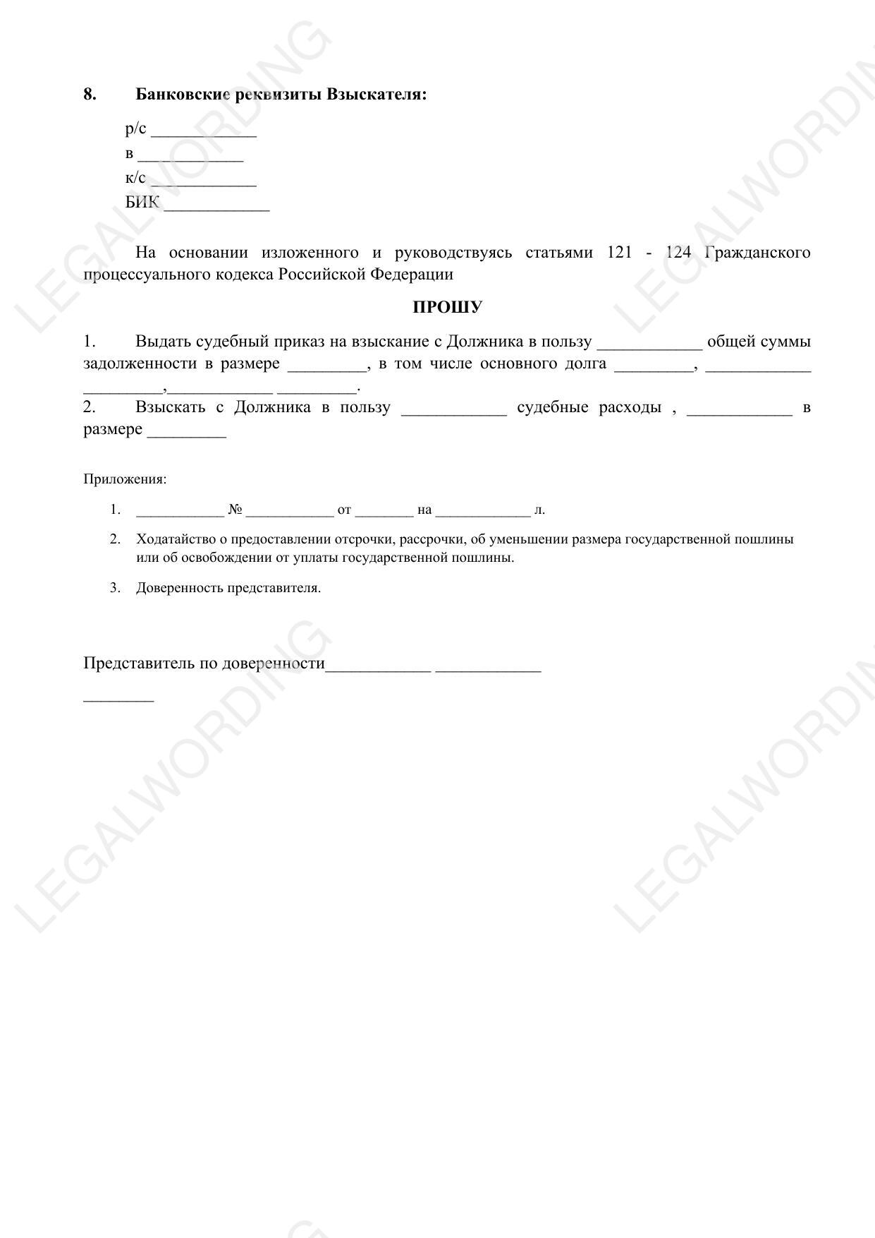 Правовое обоснование — возможность описания правовой базы для требований взыскателя.