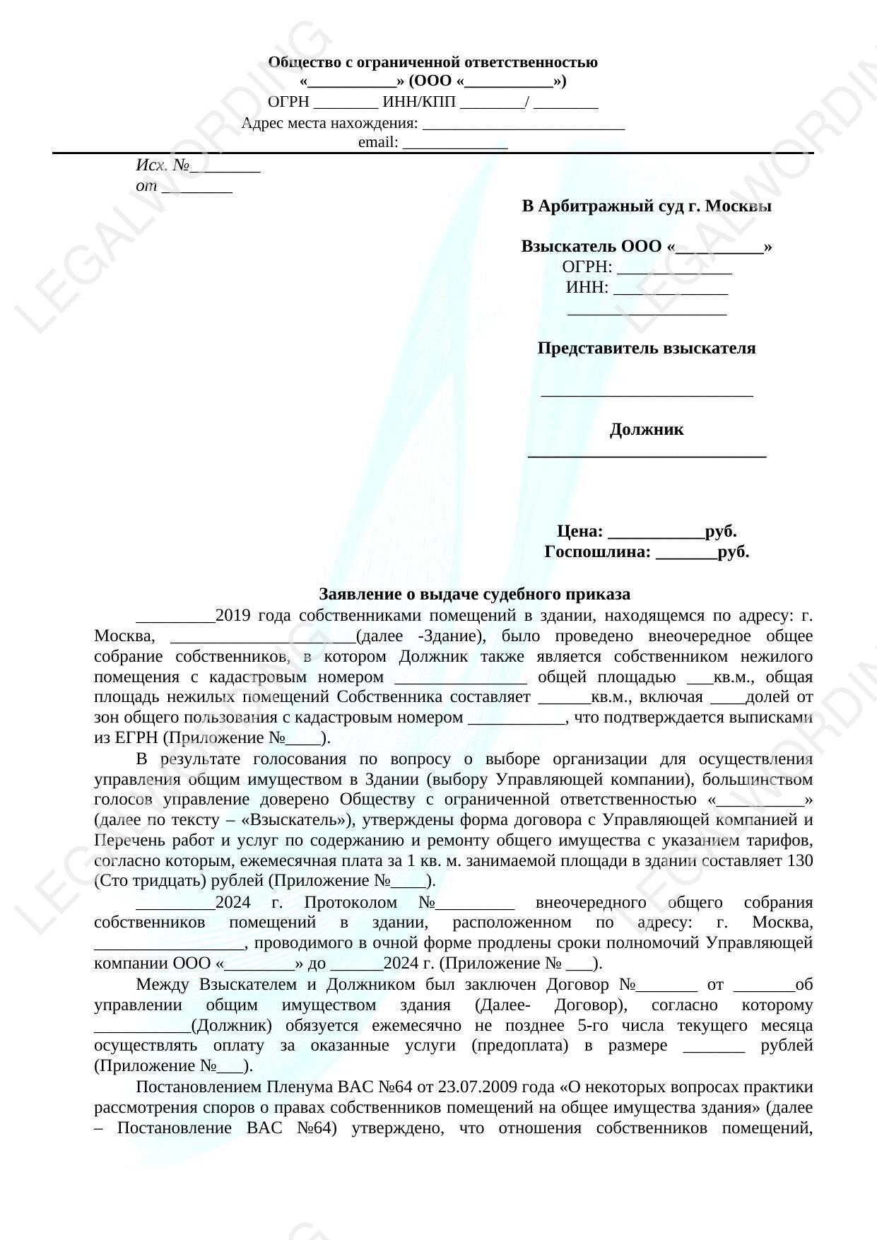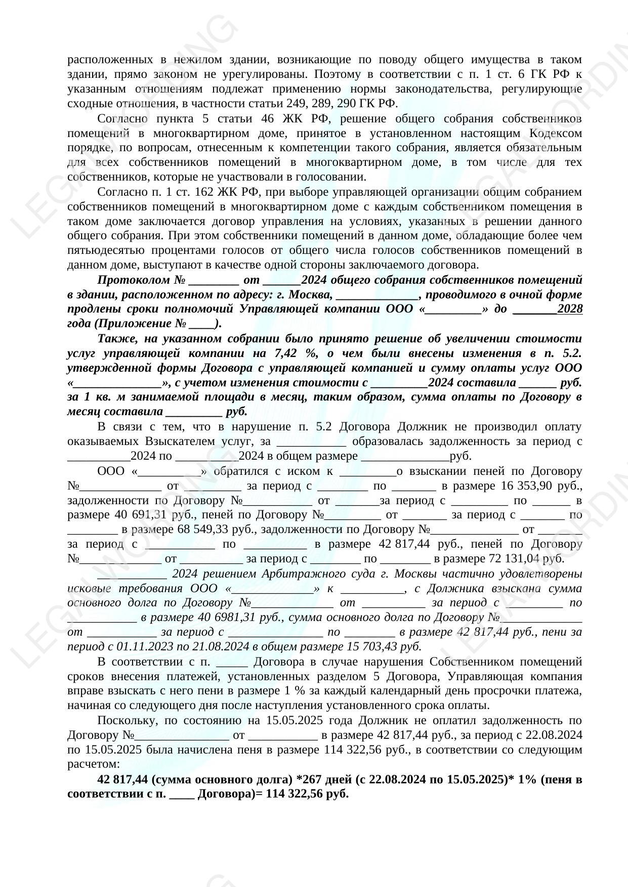 Заявление Управляющей компании в Арбитражный суд к собственнику нежилого помещения о взыскании задолженности за услуги управляющей компании по договору управления общим имуществом и вариант без заключенного договора.